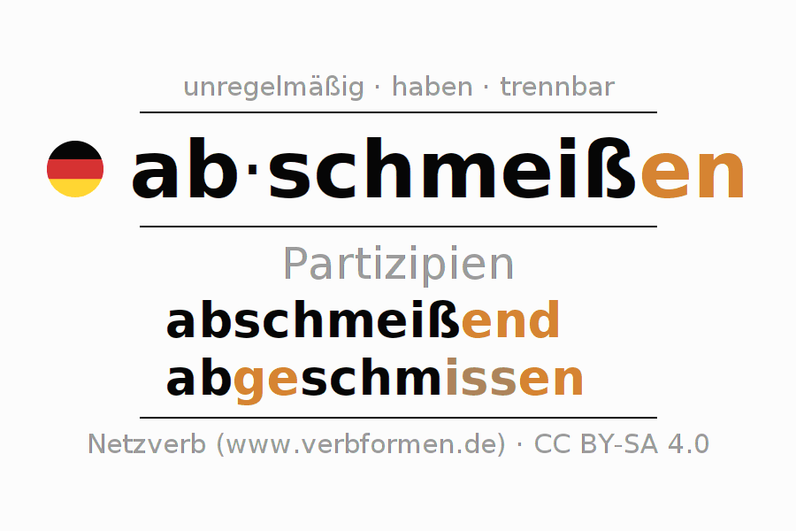 Das Verb abschmeißen vollständig in allen Personen und Numeri im Partizip Präsens Perfekt konjugiert