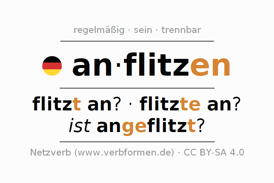 Das Verb anflitzen vollständig in allen Personen und Numeri im Partizip Präsens Perfekt konjugiert