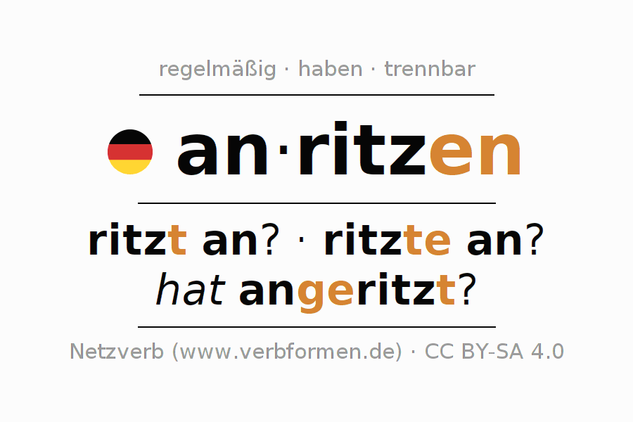 Das Verb anritzen vollständig in allen Personen und Numeri im Partizip Präsens Perfekt konjugiert
