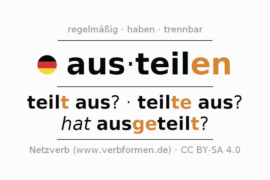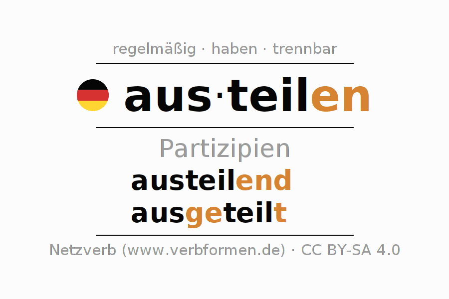 Das Verb austeilen vollständig in allen Personen und Numeri im Partizip Präsens Perfekt konjugiert