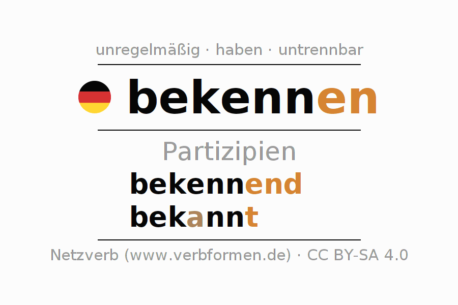 Das Verb bekennen vollständig in allen Personen und Numeri im Partizip Präsens Perfekt konjugiert