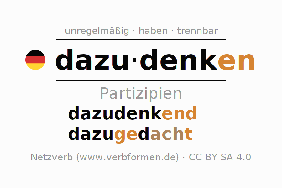 Das Verb dazudenken vollständig in allen Personen und Numeri im Partizip Präsens Perfekt konjugiert