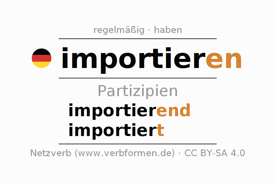Das Verb importieren vollständig in allen Personen und Numeri im Partizip Präsens Perfekt konjugiert