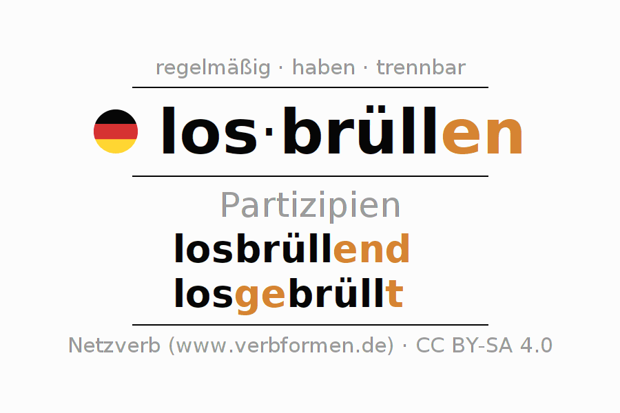 Das Verb losbrüllen vollständig in allen Personen und Numeri im Partizip Präsens Perfekt konjugiert