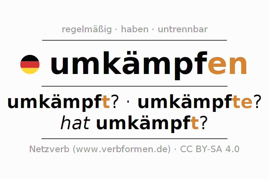 Das Verb umkämpfen vollständig in allen Personen und Numeri im Partizip Präsens Perfekt konjugiert