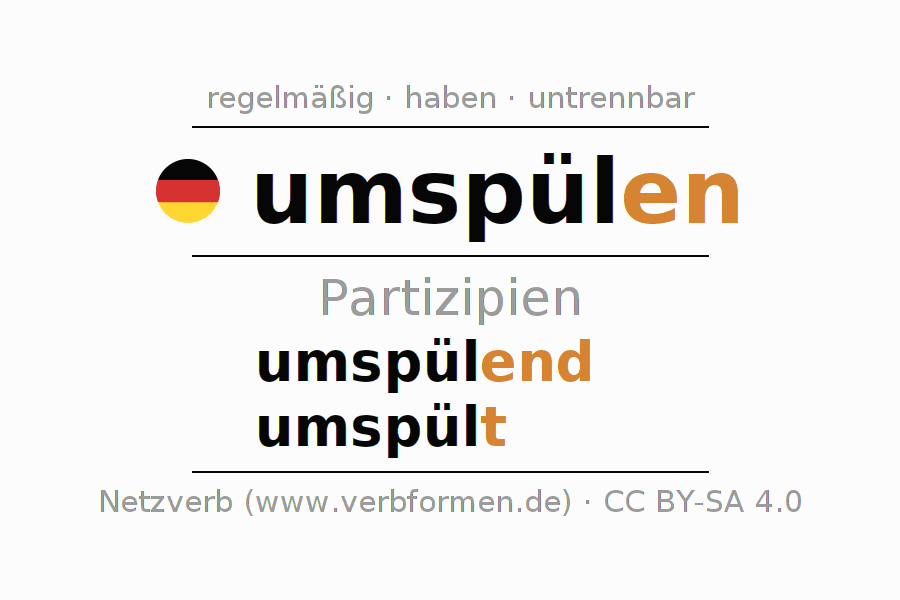 Das Verb umspülen vollständig in allen Personen und Numeri im Partizip Präsens Perfekt konjugiert