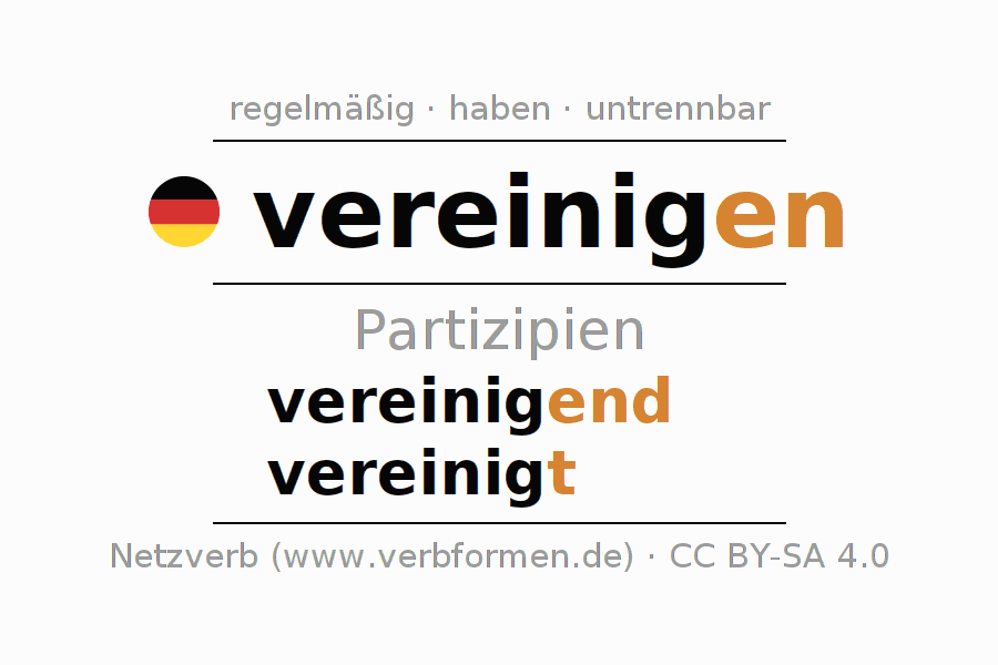 Das Verb vereinigen vollständig in allen Personen und Numeri im Partizip Präsens Perfekt konjugiert