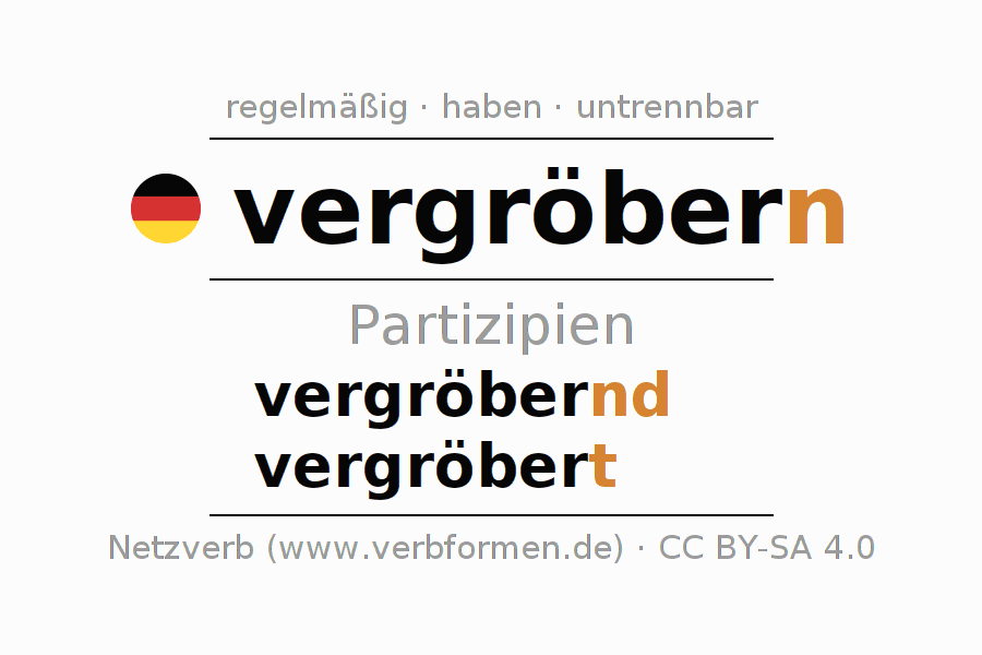 Das Verb vergröbern vollständig in allen Personen und Numeri im Partizip Präsens Perfekt konjugiert