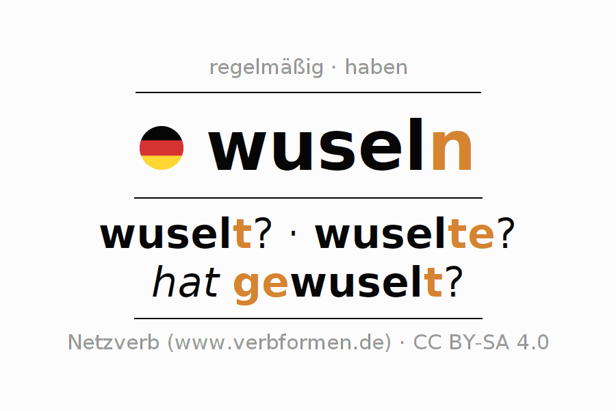 Das Verb wuseln (hat) vollständig in allen Personen und Numeri im Partizip Präsens Perfekt konjugiert