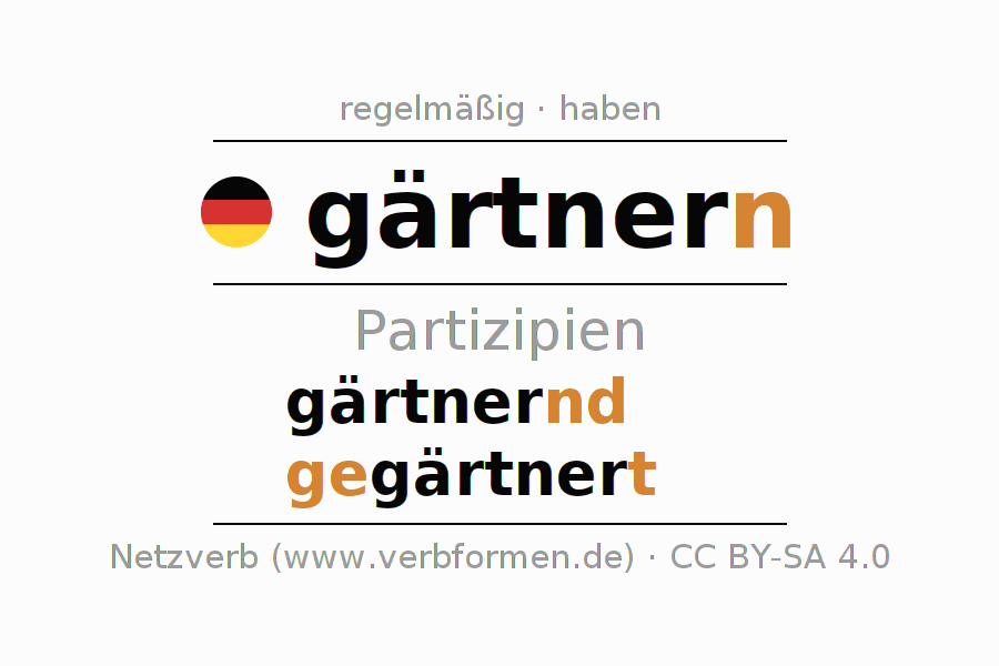 Das Verb gärtnern vollständig in allen Personen und Numeri im Partizip Präsens Perfekt konjugiert
