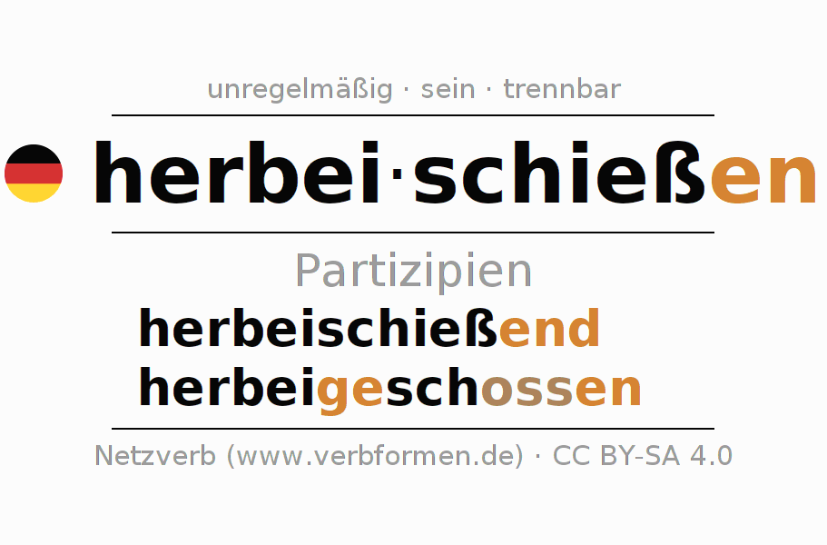 Das Verb herbeischießen vollständig in allen Personen und Numeri im Partizip Präsens Perfekt konjugiert
