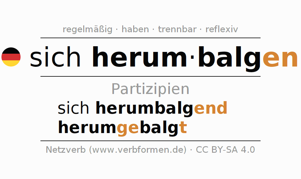 Das Verb sich herumbalgen vollständig in allen Personen und Numeri im Partizip Präsens Perfekt konjugiert