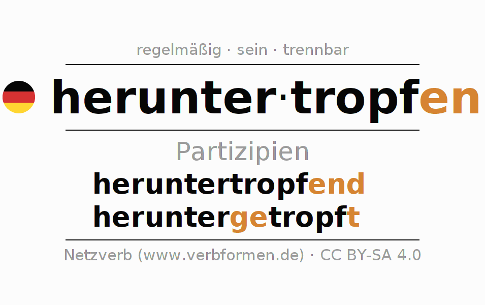 Das Verb heruntertropfen vollständig in allen Personen und Numeri im Partizip Präsens Perfekt konjugiert
