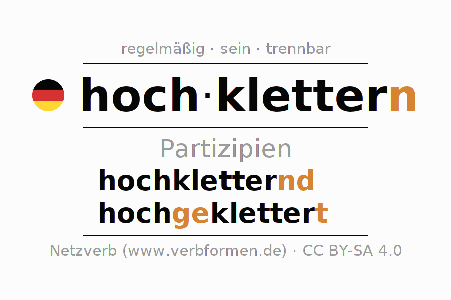 Das Verb hochklettern vollständig in allen Personen und Numeri im Partizip Präsens Perfekt konjugiert