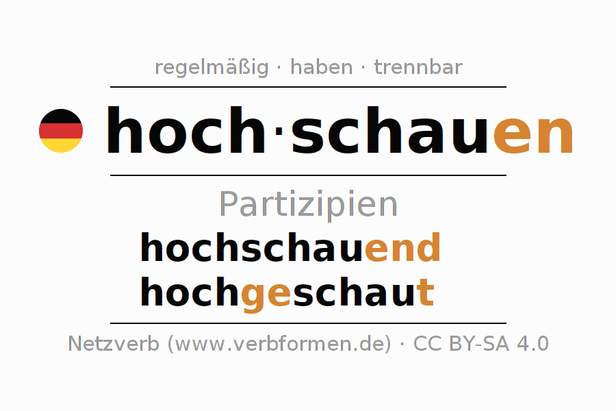 Das Verb hochschauen vollständig in allen Personen und Numeri im Partizip Präsens Perfekt konjugiert