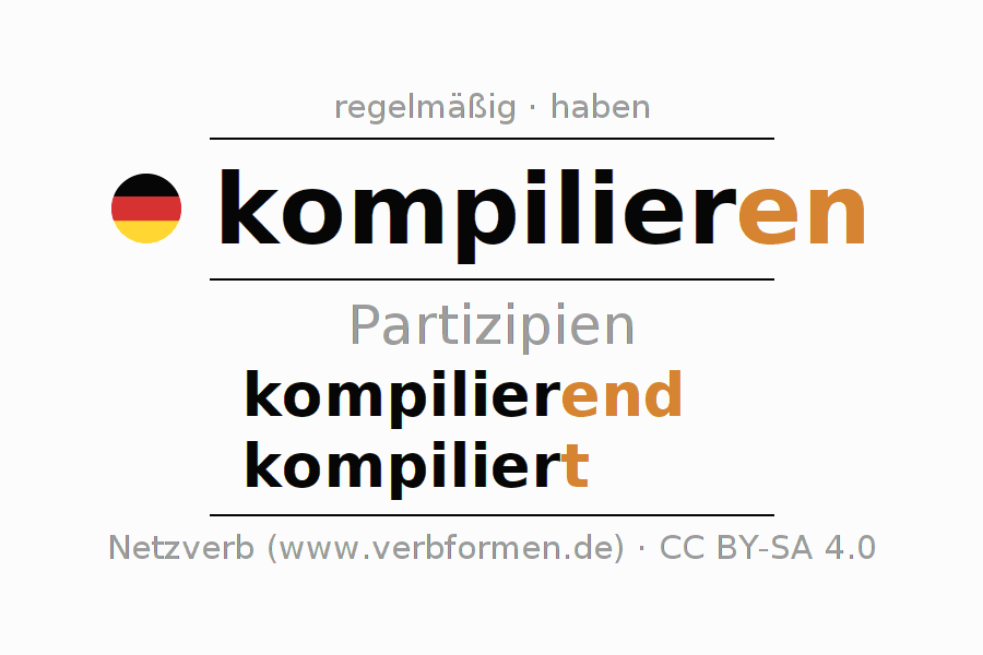 Das Verb kompilieren vollständig in allen Personen und Numeri im Partizip Präsens Perfekt konjugiert