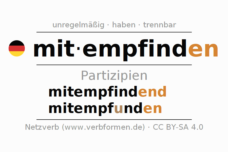 Das Verb mitempfinden vollständig in allen Personen und Numeri im Partizip Präsens Perfekt konjugiert