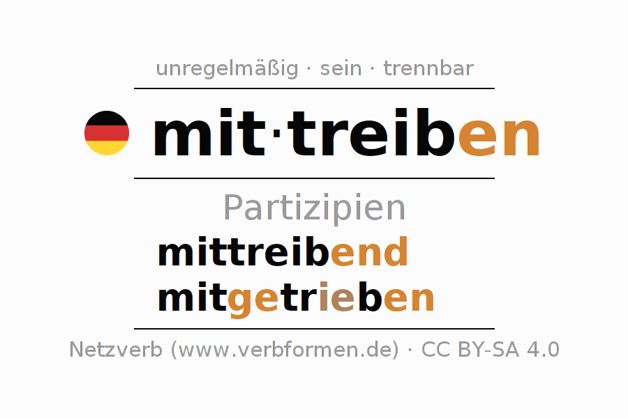 Das Verb mittreiben vollständig in allen Personen und Numeri im Partizip Präsens Perfekt konjugiert