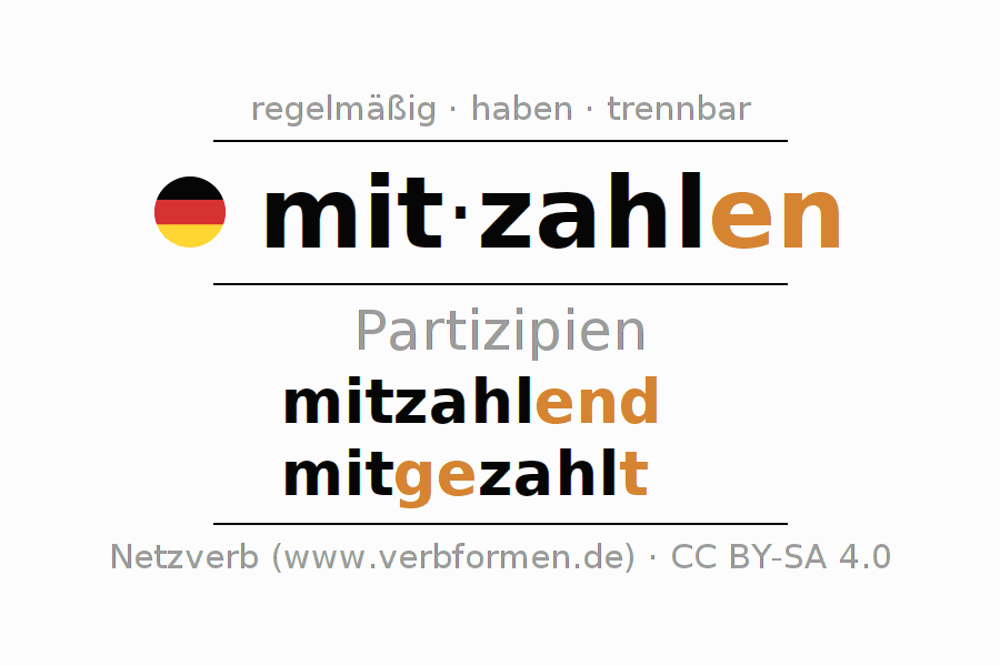 Das Verb mitzahlen vollständig in allen Personen und Numeri im Partizip Präsens Perfekt konjugiert