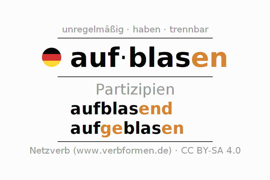 Das Verb aufblasen vollständig in allen Personen und Numeri im Partizip Präsens Perfekt konjugiert