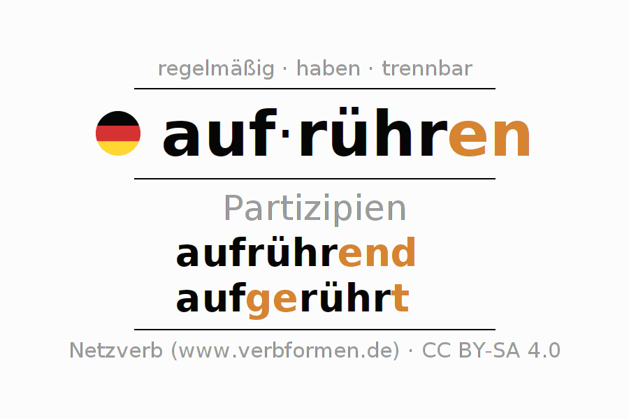 Das Verb aufrühren vollständig in allen Personen und Numeri im Partizip Präsens Perfekt konjugiert