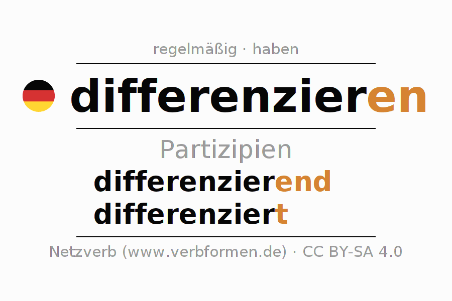 Das Verb differenzieren vollständig in allen Personen und Numeri im Partizip Präsens Perfekt konjugiert