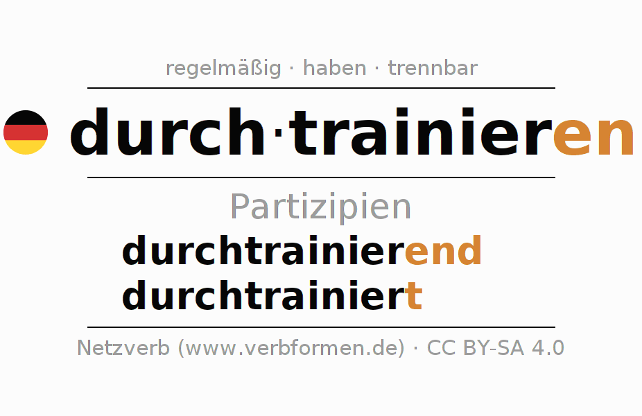 Das Verb durchtrainieren vollständig in allen Personen und Numeri im Partizip Präsens Perfekt konjugiert