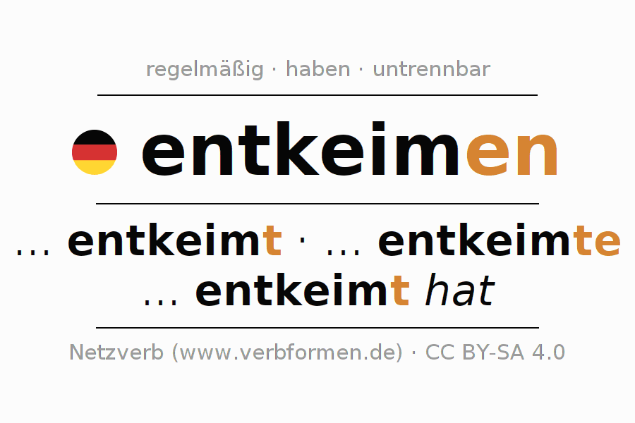 Das Verb entkeimen vollständig in allen Personen und Numeri im Partizip Präsens Perfekt konjugiert