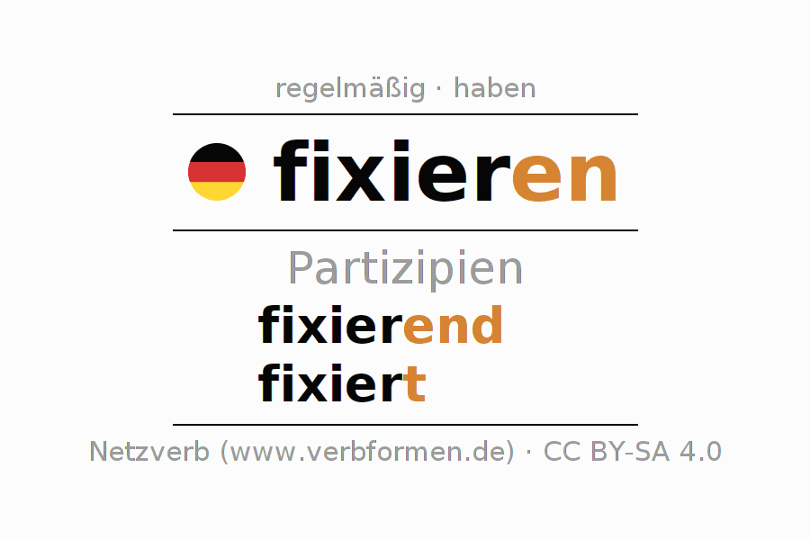Das Verb fixieren vollständig in allen Personen und Numeri im Partizip Präsens Perfekt konjugiert