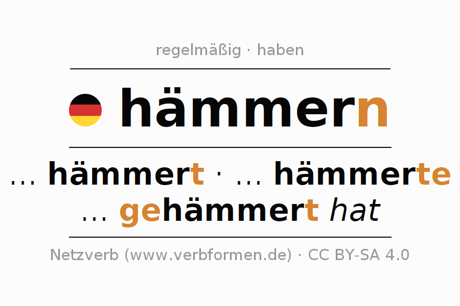Das Verb hämmern vollständig in allen Personen und Numeri im Partizip Präsens Perfekt konjugiert