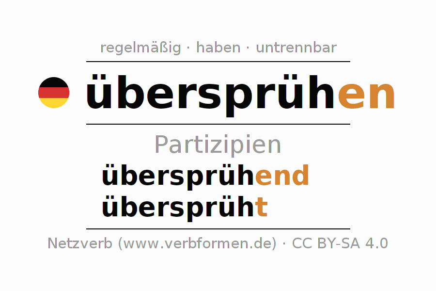 Das Verb übersprühen (hat) vollständig in allen Personen und Numeri im Partizip Präsens Perfekt konjugiert