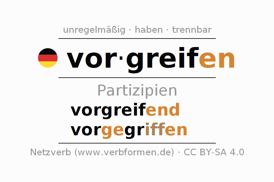 Das Verb vorgreifen vollständig in allen Personen und Numeri im Partizip Präsens Perfekt konjugiert