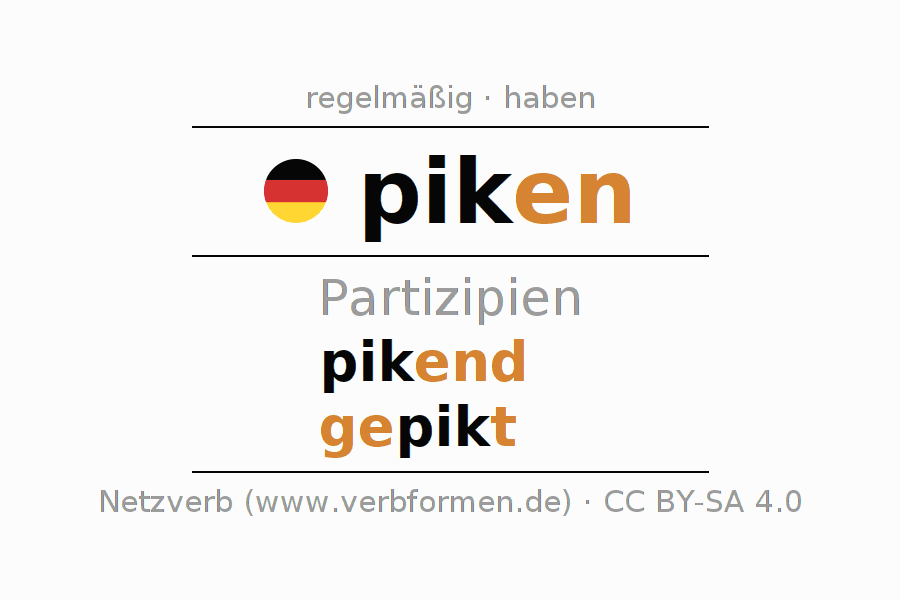 Das Verb piken vollständig in allen Personen und Numeri im Partizip Präsens Perfekt konjugiert