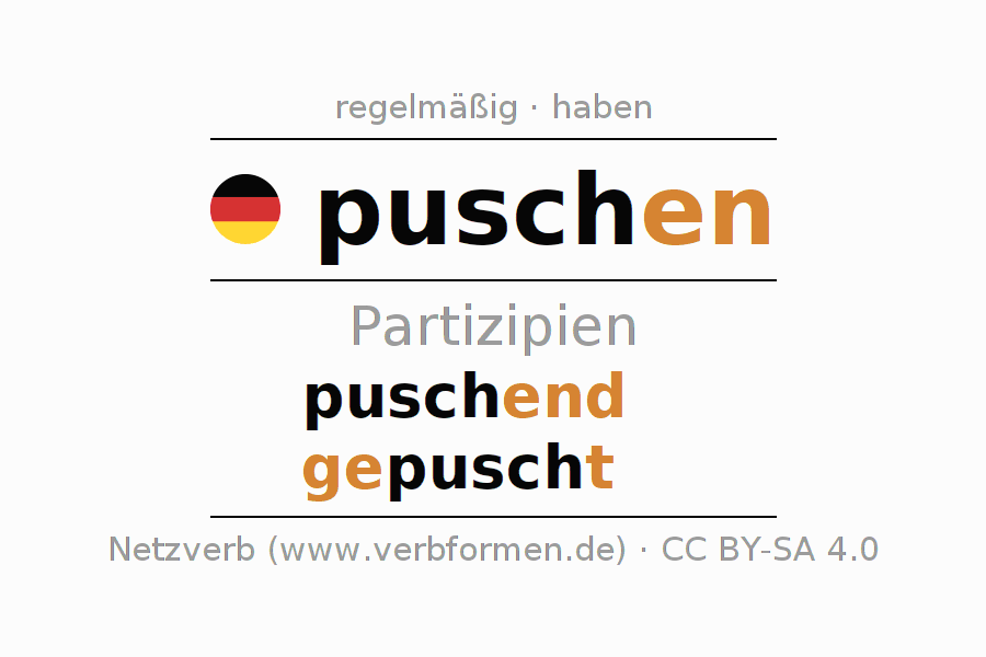 Das Verb puschen vollständig in allen Personen und Numeri im Partizip Präsens Perfekt konjugiert