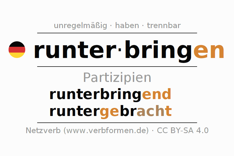 Das Verb runterbringen vollständig in allen Personen und Numeri im Partizip Präsens Perfekt konjugiert