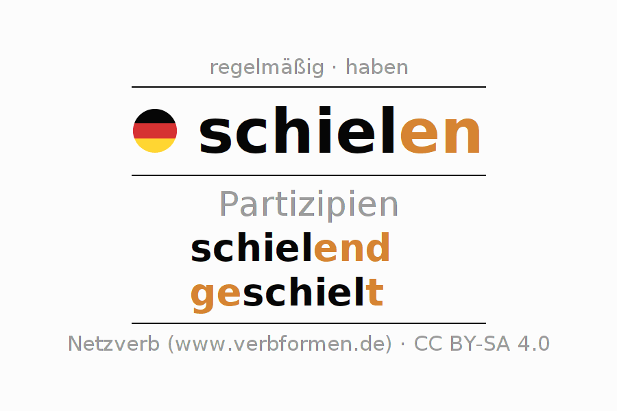 Das Verb schielen vollständig in allen Personen und Numeri im Partizip Präsens Perfekt konjugiert