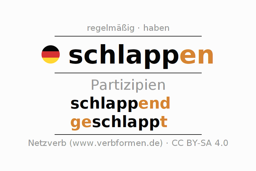 Das Verb schlappen vollständig in allen Personen und Numeri im Partizip Präsens Perfekt konjugiert