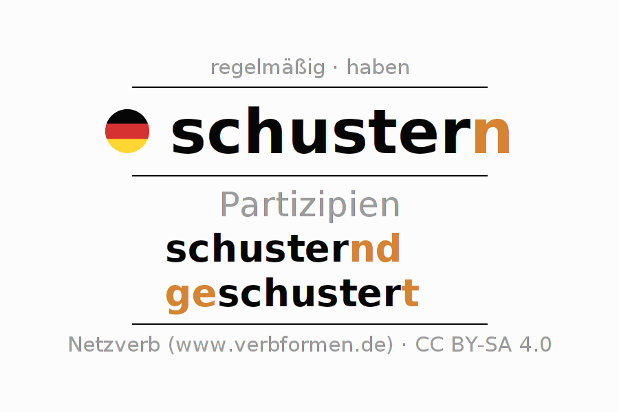 Das Verb schustern vollständig in allen Personen und Numeri im Partizip Präsens Perfekt konjugiert