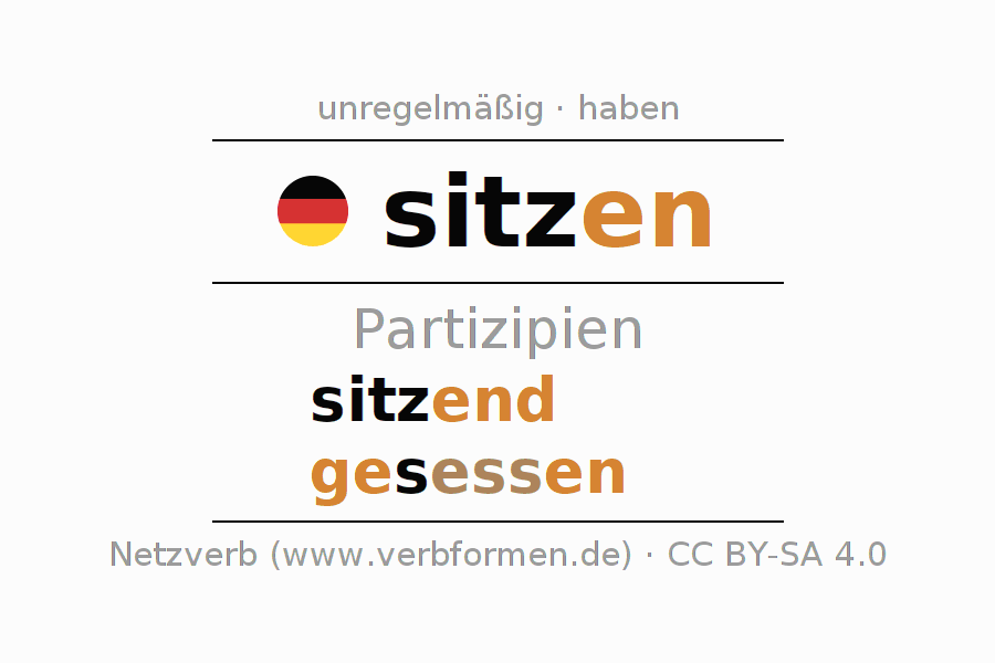Das Verb sitzen (hat) vollständig in allen Personen und Numeri im Partizip Präsens Perfekt konjugiert