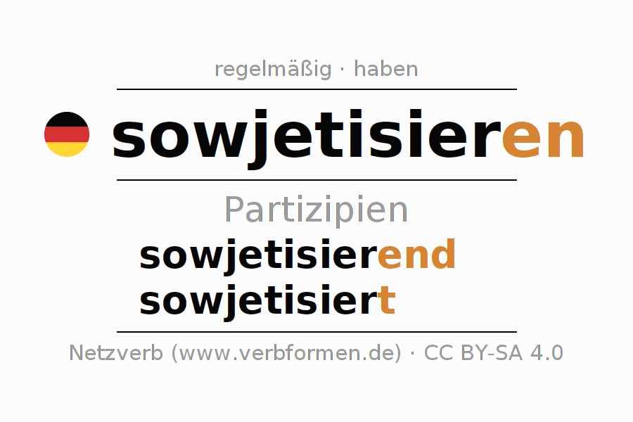 Das Verb sowjetisieren vollständig in allen Personen und Numeri im Partizip Präsens Perfekt konjugiert