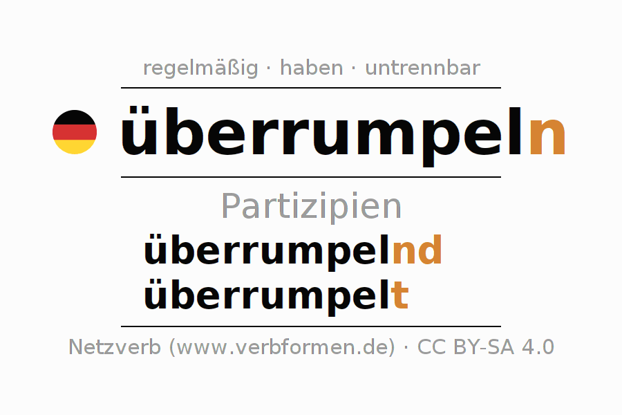 Das Verb überrumpeln vollständig in allen Personen und Numeri im Partizip Präsens Perfekt konjugiert