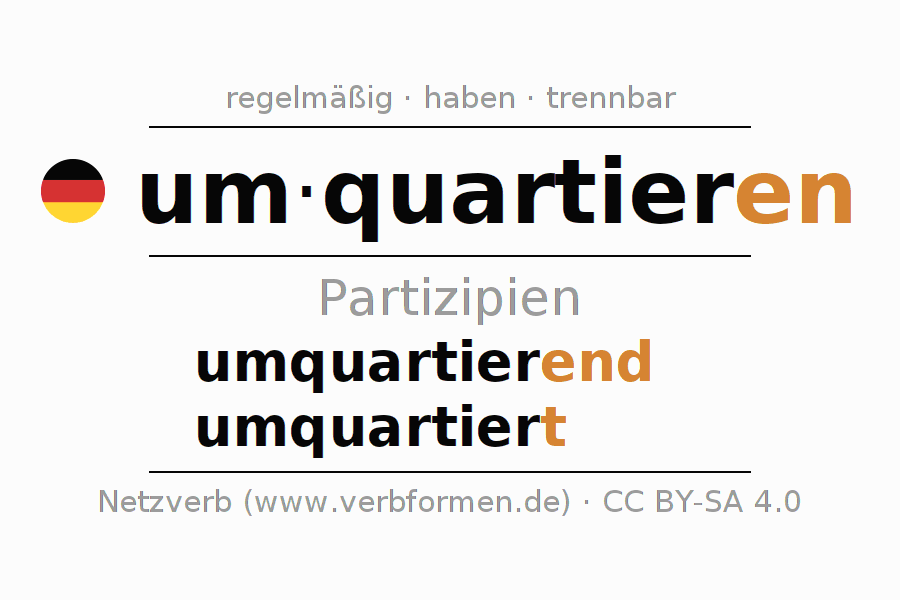 Das Verb umquartieren vollständig in allen Personen und Numeri im Partizip Präsens Perfekt konjugiert