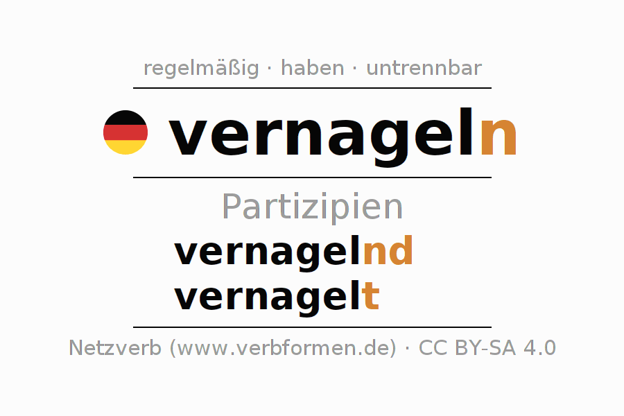 Das Verb vernageln vollständig in allen Personen und Numeri im Partizip Präsens Perfekt konjugiert