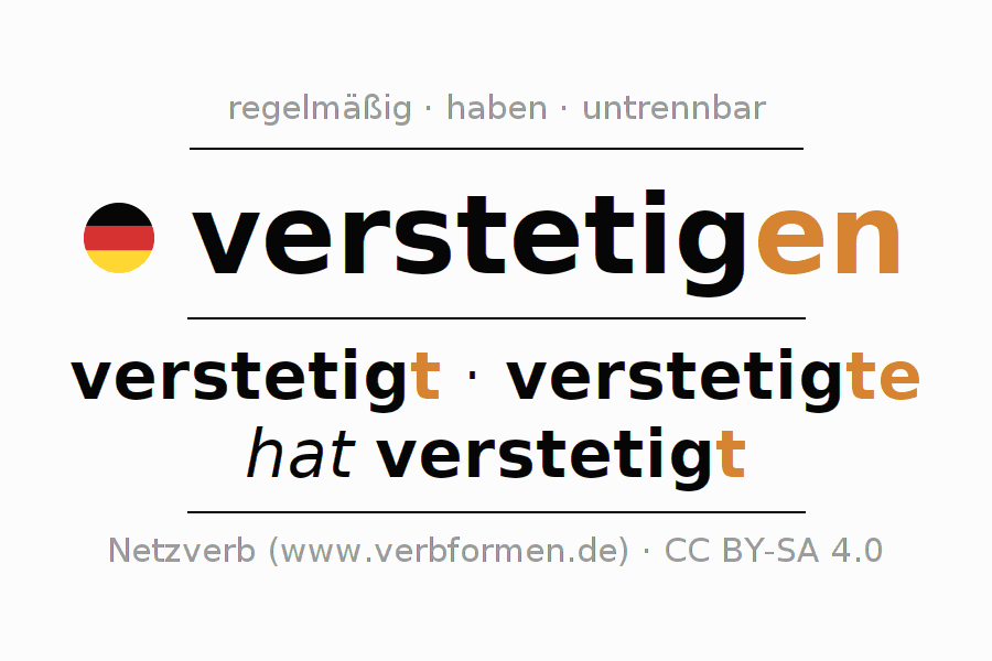 Das Verb verstetigen vollständig in allen Personen und Numeri im Partizip Präsens Perfekt konjugiert