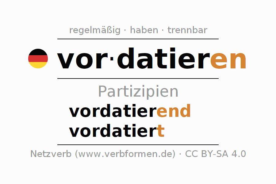 Das Verb vordatieren vollständig in allen Personen und Numeri im Partizip Präsens Perfekt konjugiert