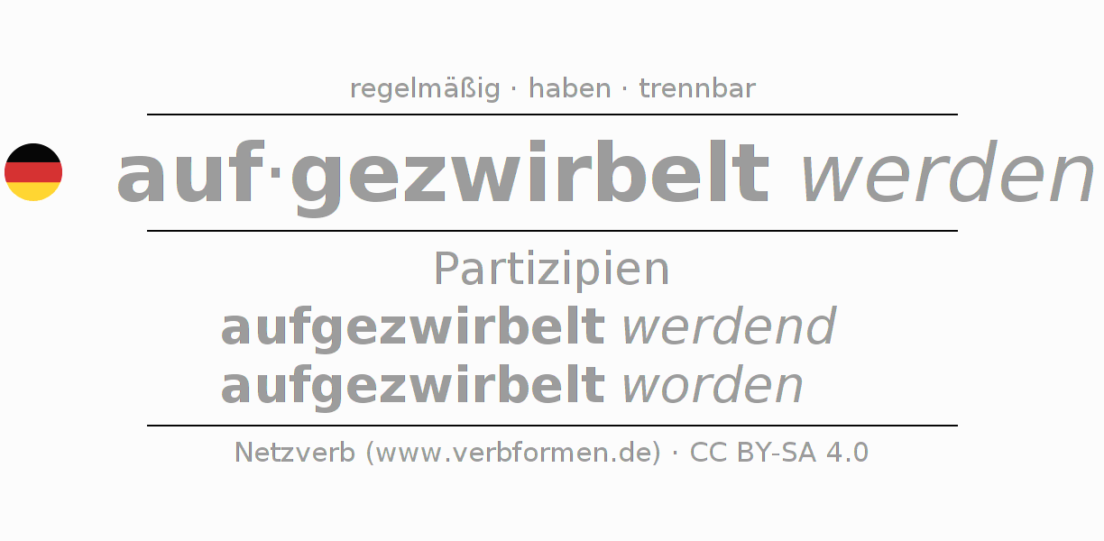 Das Verb aufzwirbeln vollständig in allen Personen und Numeri im Partizip Präsens Perfekt konjugiert