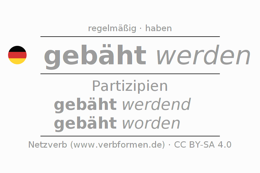 Die Konjugation von bähen im Partizip Präsens Perfekt Mittelwort Vorgangspassiv ist: gebäht werdend, gebäht worden.Die Bildung dieser Formen entspricht gewissen grammatischen Regeln. So auch die Vorgaben zur Konjugation der einfachen Verbformen von bähen im Partizip. Kommentare ☆