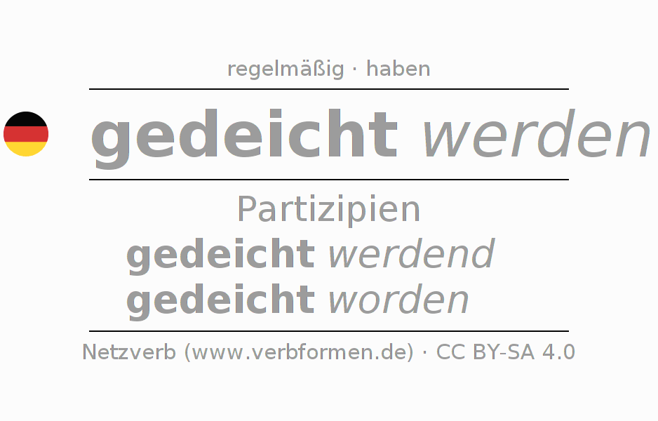 Das Verb deichen vollständig in allen Personen und Numeri im Partizip Präsens Perfekt konjugiert