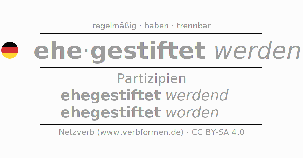 Das Verb ehestiften vollständig in allen Personen und Numeri im Partizip Präsens Perfekt konjugiert