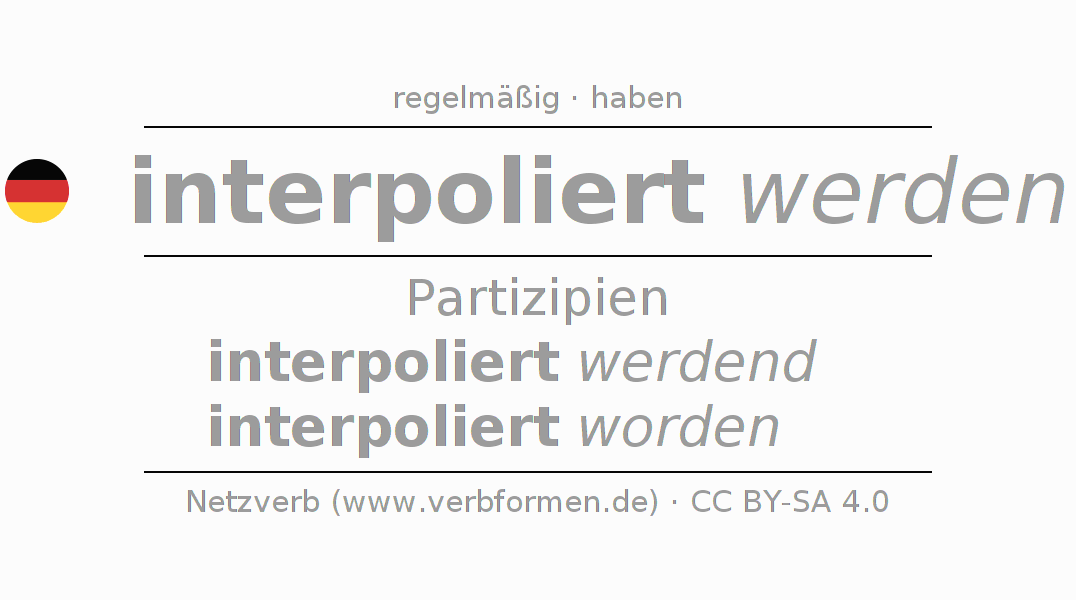 Die Konjugation von interpolieren im Partizip Präsens Perfekt Mittelwort Vorgangspassiv ist: interpoliert werdend, interpoliert worden.Die Bildung dieser Formen entspricht gewissen grammatischen Regeln. So auch die Vorgaben zur Konjugation der einfachen Verbformen von interpolieren im Partizip. Kommentare ☆